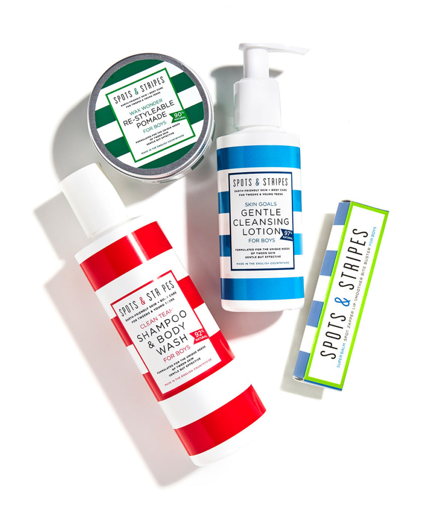 So, I decided to create the products myself. As a beauty editor of over 25 years, I’d tried a zillion brands; I knew my stuff and I did my research (which wasn’t easy, because there aren’t many studies on this age group). I convinced one of the UK’s best natural manufacturers to take me on. I tested the formulas on my girls, their friends, and the sons of my friends (and, yes, that’s them all in the pictures here and on other pages). After two years of trying and tweaking, Spots & Stripes was born.