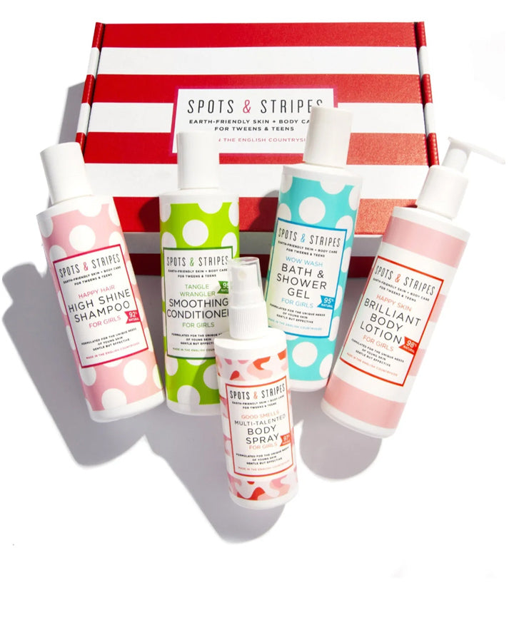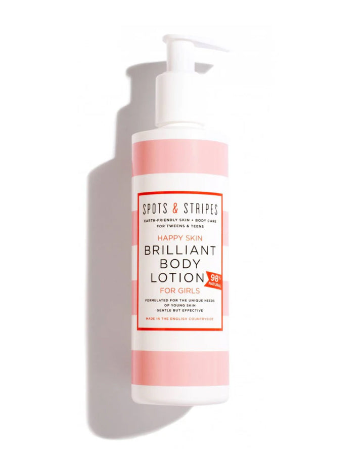 True gift brilliance for the girl in your life. Good Smells Multi-Talented Body Spray uses a girl-friendly blend of mighty essential oils that are fresh-smelling and gentle on young skin, but powerful enough to take on sweaty trainers. Happy Skin Brilliant Body Lotion is a dreamy-smelling, creamy-textured body lotion with super powers (bonus: it zaps bacteria and won't block pores, so bye-bye bacne!). Full size and packed in our baby-pink, stripy gift box with stickers and a card.