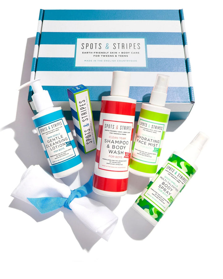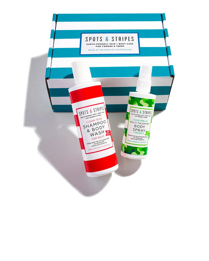 If you only use two Boy products, make them these - and gift them to the tween or teen boy in your life. Clean Team Shampoo & Body Wash is an award-winning, multi-tasking formula that brilliantly cleans teen/tween bodies and hair without stripping skin of essential moisture (did we mention it also smells like grass and clean t-shirts?). Skin Goals Gentle Cleansing Lotion lifts away dirt, leaves skin balanced and shows blemish-causing bacteria who's boss. Full size and packed in our dark blue, stripy gift box with stickers and a card.