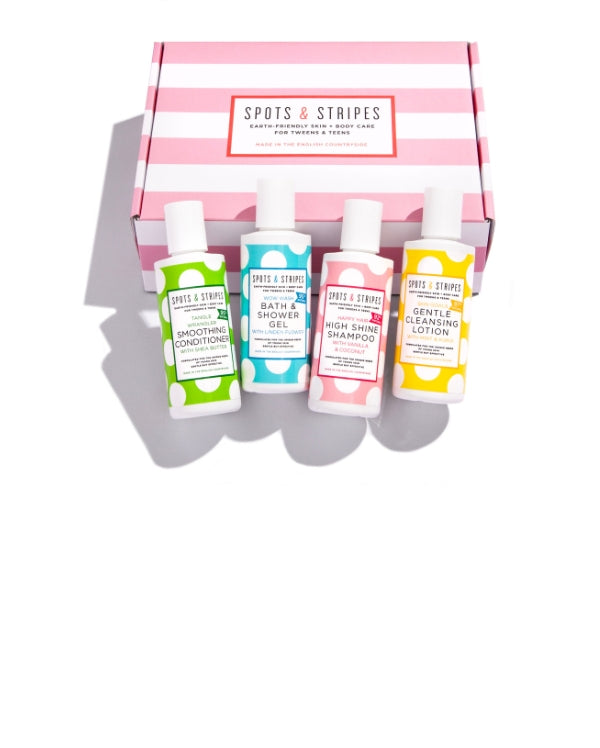 NEW! A bumper Gift Box of all our Girl and Boy favourites in 100ml mini sizes. Super-cute, sulphate-free and guaranteed to keep on-the-move teens/tweens clean, clear-skinned, glossy-haired and smelling oh-so-good. Perfect for holidays, sleepovers and sports bags, this box contains: Clean Team Shampoo & Body Wash, Tangle Wrangler Smoothing Conditioner, Happy Hair High Shine Shampoo, Wow Wash Bath & Shower Gel, Girl and Boy versions of our famous Skin Goals Gentle Cleansing Lotion. Packed in our signature red, stripy gift box with stickers and a card.