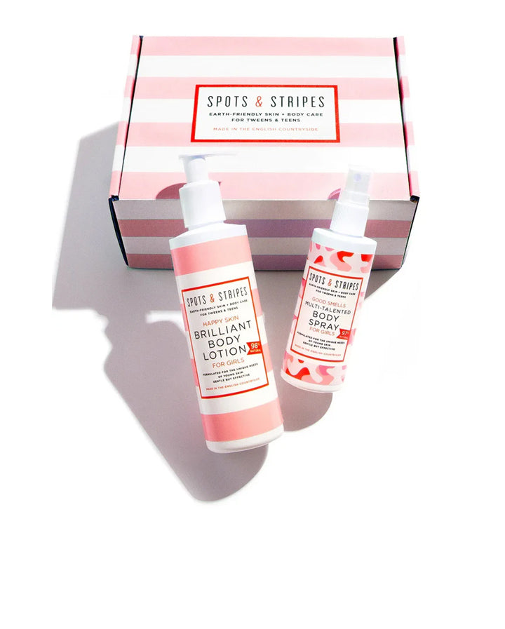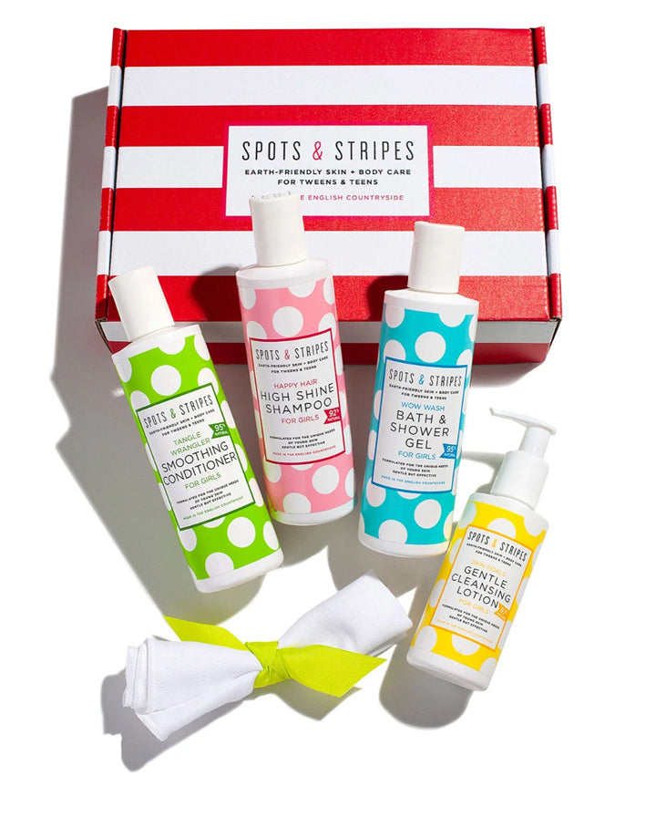Our biggest teen box ever! Packed with award-winning products, specially formulated for young skin, hair and bodies. Skin Goals Gentle Cleansing Lotion (with its own organic muslin cloth), Skin Goals Hydrating Face Mist and our genius Super Balm Spot Zapper, Lip Smoother, Bite Buster are super-effective on blemishes - cleansing, soothing and hydrating, without stripping delicate skin of essential moisture. Happy Hair High Shine Shampoo (bonus: it smells like your beach holidays). Good Smells Multi-Talented Body Spray uses a girl-friendly blend of mighty essential oils that are fresh-smelling and gentle on young skin, but powerful enough to take on sweaty trainers. Full size and packed in our signature red, stripy gift box with stickers and a card.